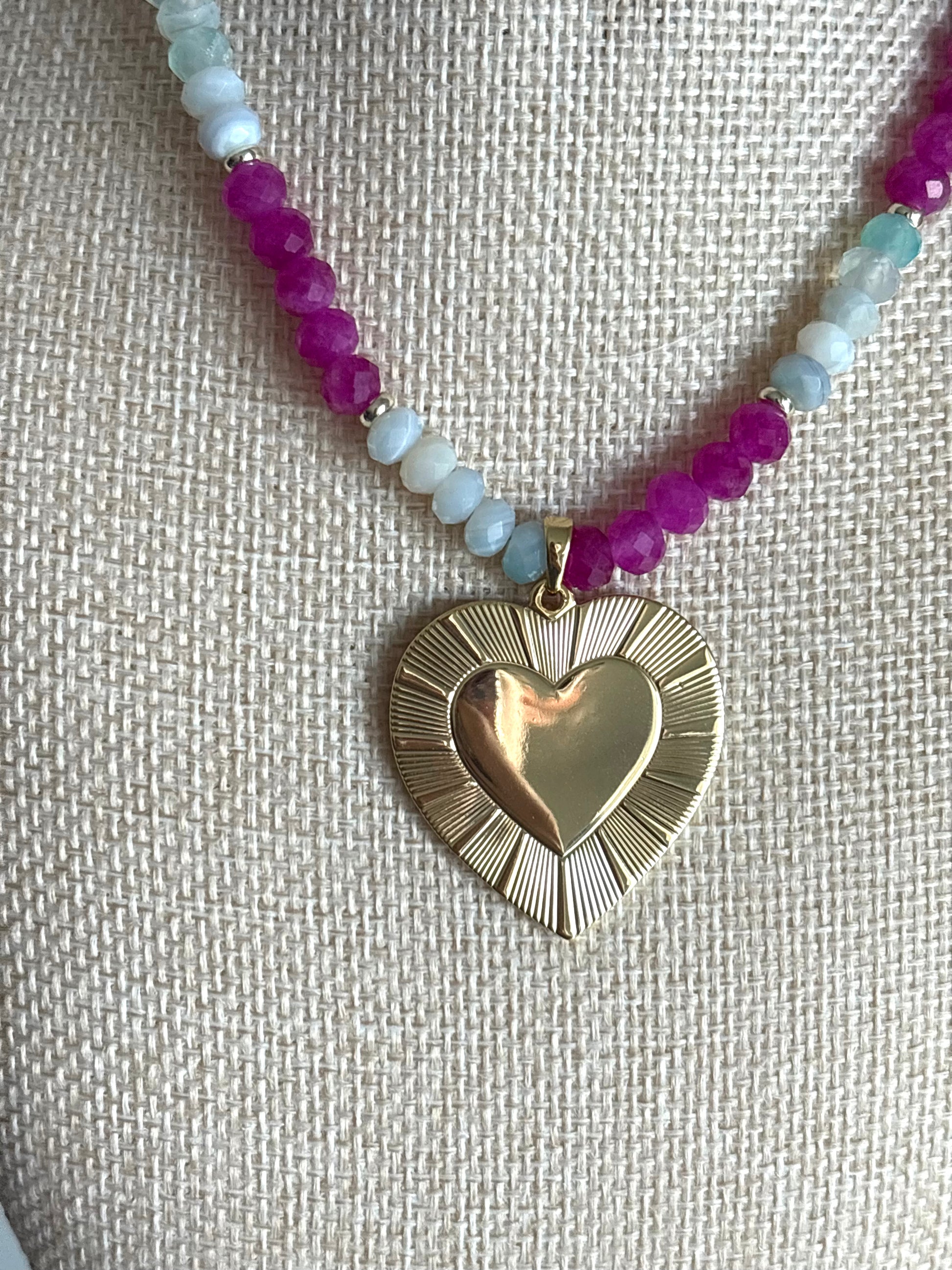 Aqua Agate & Ruby Jade Necklace with 18k Gold-Filled Heart Pendant