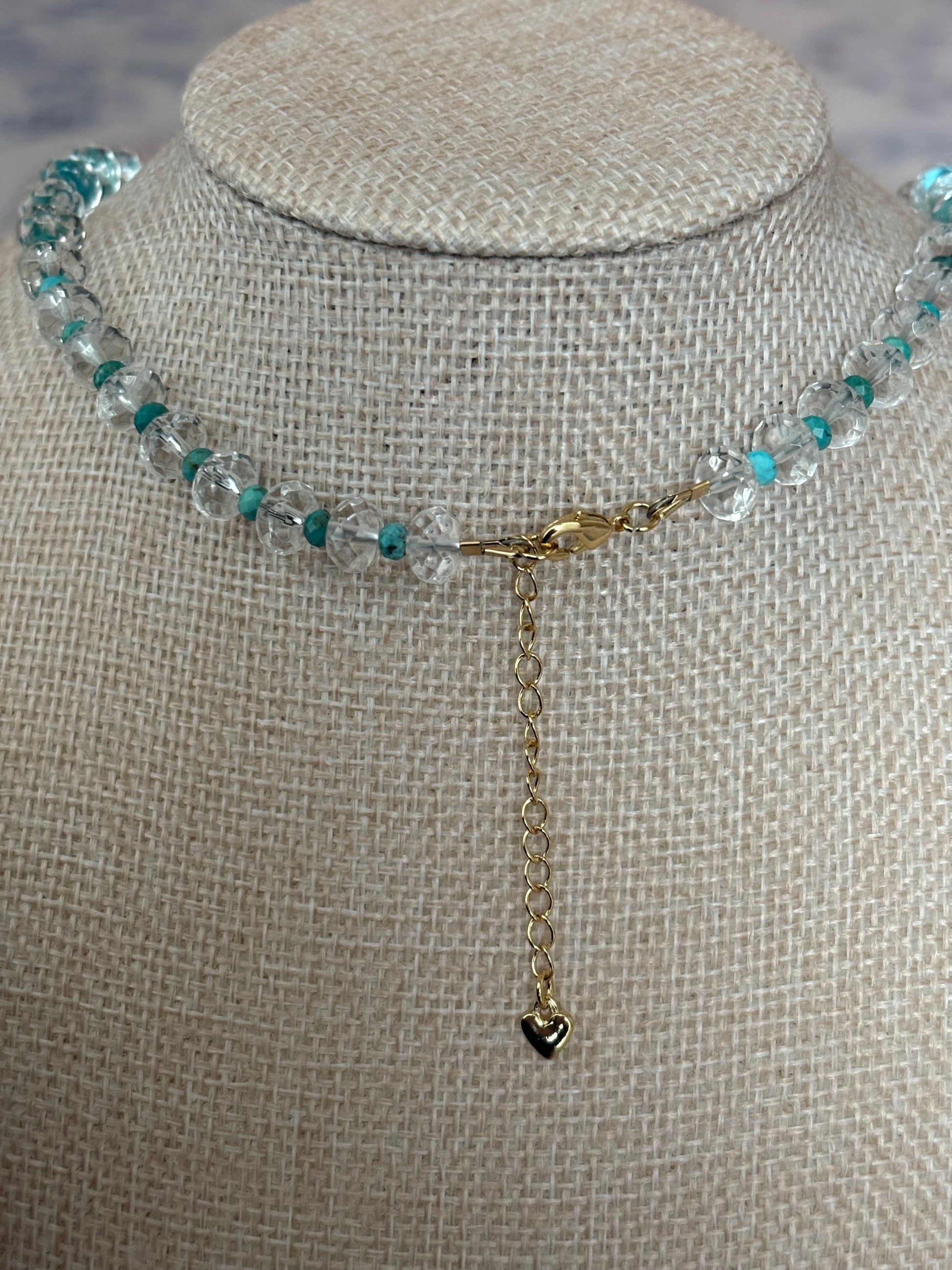 Dive into effortless elegance with this one-of-a-kind statement piece. Handcrafted with 8mm faceted crystal quartz and turquoise beads, this necklace is a harmonious blend of natural energy and refined beauty. At its center, a large luminous baroque pearl radiates soft, ethereal light, framed by 18k gold-filled findings and spacers for a touch of luxury.