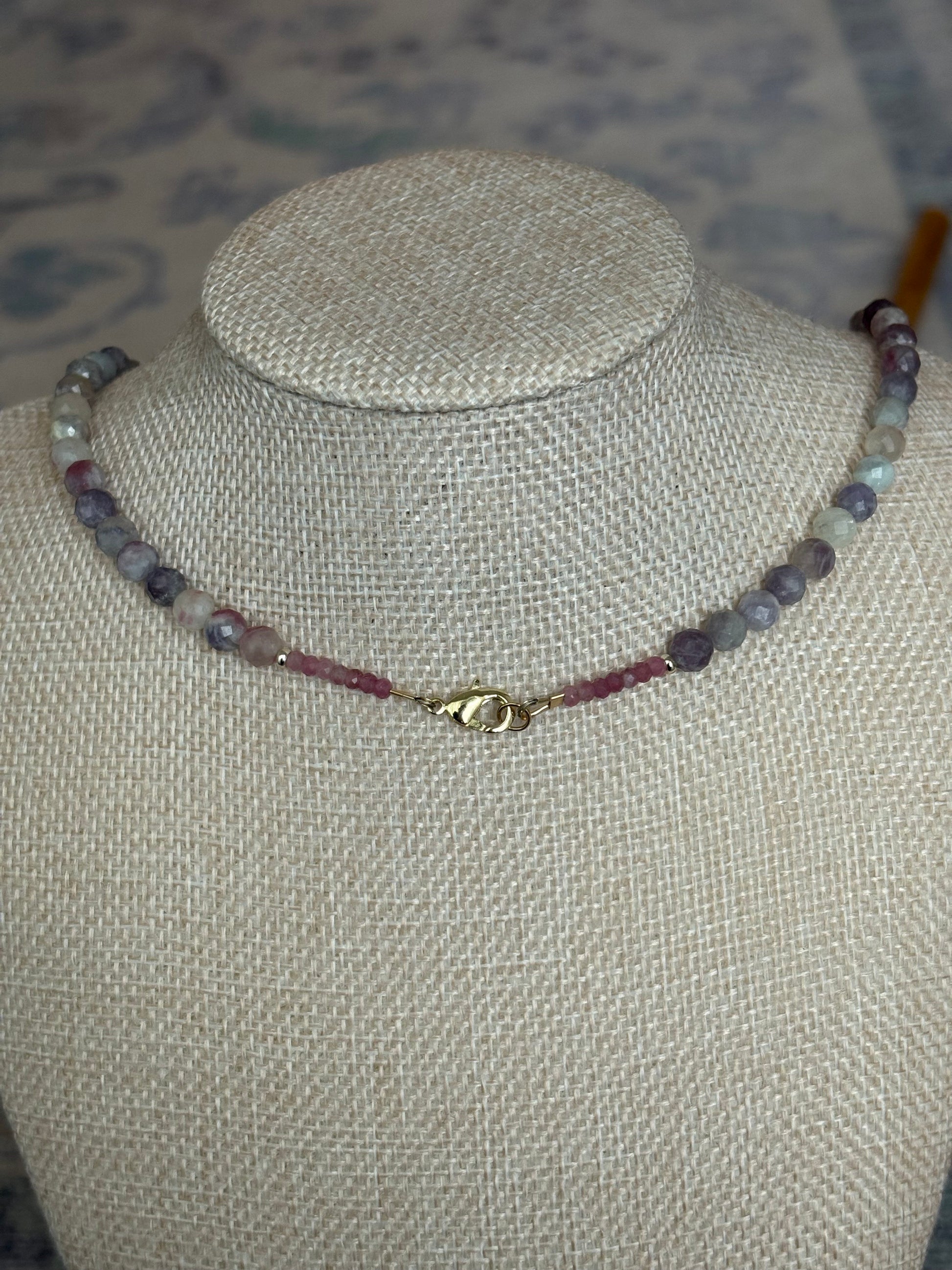 A dreamy dance of soft pinks and gentle lilacs, this necklace is handcrafted to feel like a talisman of love and calm. Each 6mm microfaceted bead of pink tourmaline and lepidolite nestled in quartz catches the light like a secret glow, while luminous freshwater pearls drift between delicate 18K gold spacers, adding warmth and subtle shimmer.